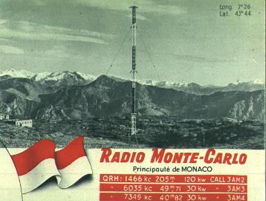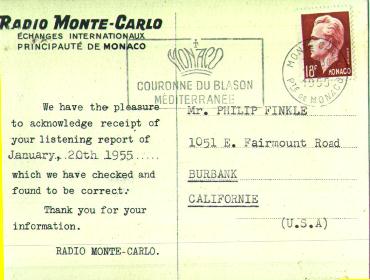 MONACOQSL card from Radio Monte Carlo for report on 20 January 1955 of 3AM4 on 7.349 MHz. Power was 30,000 watts.![]() ![]() This QSL was from the Radio Monte Carlo when it had its own progranmming on shortwave. This was a rather difficult "catch" from the west coast of the U.S.A. Back to Home Page