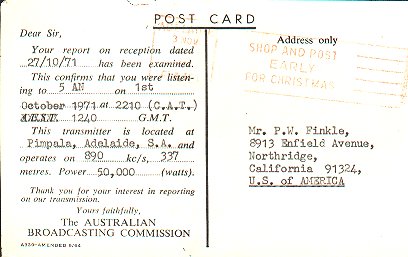 QSL from 5AN on 1 October 1971 on 890 KHz. Power was 50 kw.