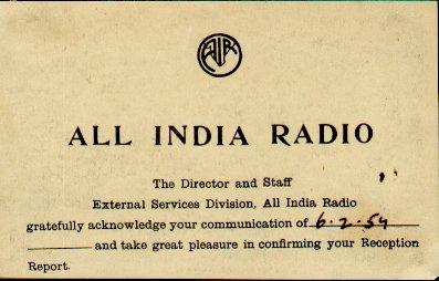 This QSL was from AIR station VUD from New Delhi. This was a fairly difficult station to log in those days.