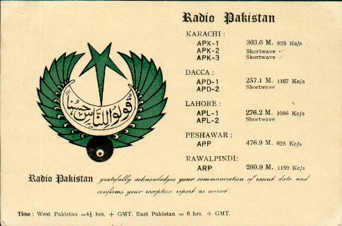This QSL was from the Radio Pakistan station APK-2 in Karachi.