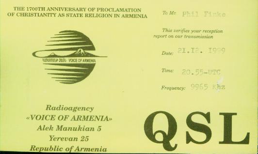 QSL card from the Voice of Armenia on 21 December 1995 on 9.965 MHz.