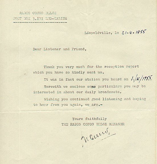 BELGIAN CONGOQSL letter from Radio Congo-Belge on 2 April 1955 on 6.140 MHz.This QSL letter is from Radio Congo Belge in Leopoldville.. This was not an easy station to log on the west coast. Station OTC, which relayed ORU in Brussels to North America, was a powerhouse on 25 meters.
