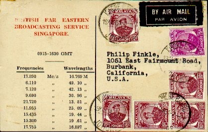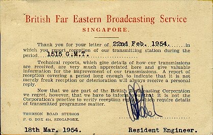 MALAYA - SINGAPORENon-QSL card from the British Far Eastern Broadcasting Station on 2 February 1954 on 9.690 MHz.This "non-QSL" was issued by the British Far Eastern Broadcasting Station in Singapore. Too bad the BBC had (has) that policy of not QSLing, after all, they will spend the time and postage to reply to reports! At this time Singapore was part of Malaya. After the formation of Malaysia, Singapore was separated supposedly because its large non-Malay population. |
