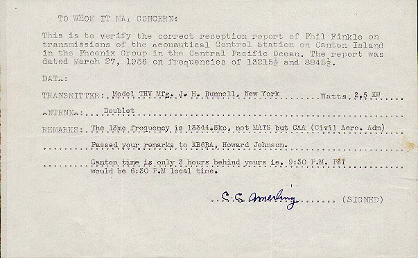CANTON ISLAND (PHOENIX GROUP)QSL from Canton Island Aeradio on 27 March 1956 on 8.8455 and 13.3445 MHz. Power was 2500 watts.This QSL form was from Canton Island Aeradio in the Phoenix Group (now part of Kiribati). In those days we had analog readouts that were very approximate. A few lucky souls had surplus BC-221 frequency meters that they could use to zero beat a signal and get its precise frequency. |