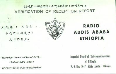 This QSL was from the Radio Addis Ababa on 15.344 mHz. This was a rather rare "catch" from the west coast of the U.S.A. Back to Home Page |