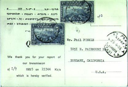 ETHIOPIA QSL card from Radio Addis Ababa for report on 1 July 1955 on 15.344 mHz. Power was 3000 watts.