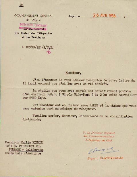 ALGERIA (FRENCH DEPARTMENT)QSL from Algerian PTT station, on 15 April 1956 on 8.960 MHz. Power was 2 kw.This QSL letter was from the French Algerian Posts, Telephone, and Telegraph service in Algiers. These stations, while awaiting traffic, ran looped SSB announcements, this one in French. |