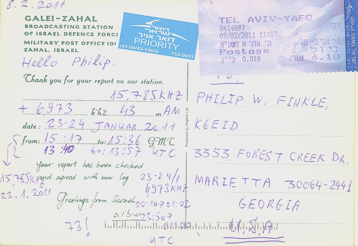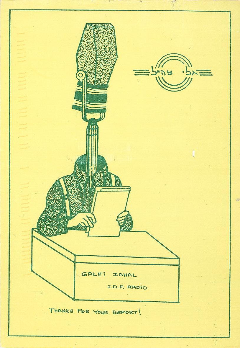 This QSL was from the Galei Zahal, the Israel Defense Force radio station in Zahal, Israel. According to WRTVH, this outlet's power is 10 3 kW.