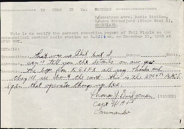 GREENLANDQSL from Søndrestrom Aeradio on 11 December 1955 on 5.6265 MHz.This QSL form was from Søndrestrom Aeradio in Søndre Stromfjord. In all cases where the USAF operated stations, they were unable to provide technical details due to security restrictions. |