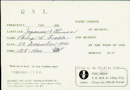 This QSL card was from HLAZ, the Far East Broadcasting Company.