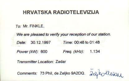 QSL from HRT on 30 December 1997 on 1134 KHz.