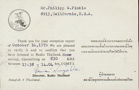 QSL card from the Radio Thailand in Bangkok for a report of 16 October 1976 on 830 KHz. Power was 50,000 watts.