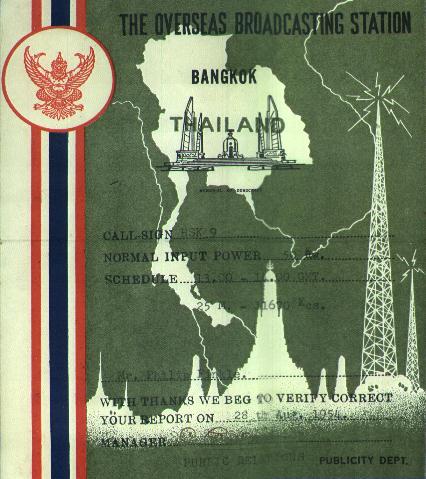 THAILAND QSL card from the Overseas Broadcasting Station of Thailand in Bangkok for a report of 28 August 1954 on 11.670 MHz. Power was 50,000 watts. ![]() Interestingly, this station used to have a North American service in the evening west coast USA time that was mostly inaudible! The best chance to log this station was in the early morning. Back to Home Page |