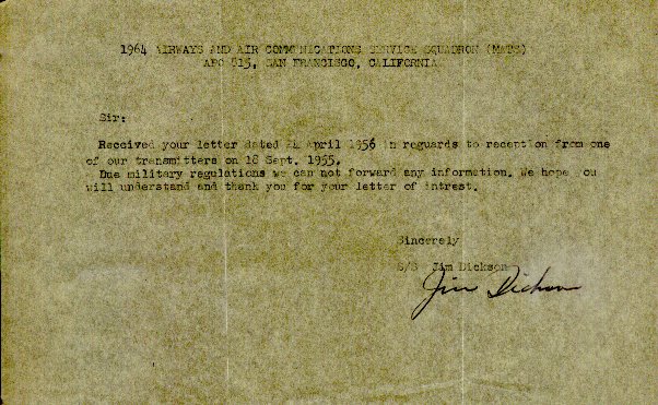 This quasi-QSL letter was from Iwo Jima Air Traffic Control. Mr. Dickson was more innocuous with his letter than any other USAF station!