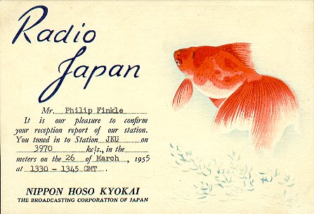 JAPANQSL cards from the Radio Japan:JOB-6 on 3 October 1953 on 11.725 MHz JOA-2 on 23 January 1955 on 7.2425 MHz JOA-3 on April 1955 on 9.695 MHz JOA-3 on 11 November 1955 on 9.695 MHz JOB 0n 9 December 1955 on 6.080 MHz JKU on 26 March 1956 on 3.970 MHz.