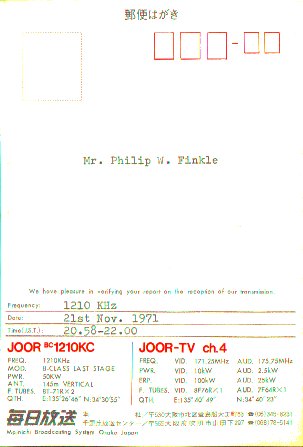 QSL from JOOR on 21 November 1971 on 1210 KHz.