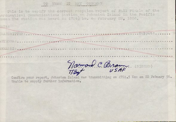 This QSL form was from Johnston Aeradio. In all cases where the USAF operated stations, they were unable to provide technical details due to security restrictions.