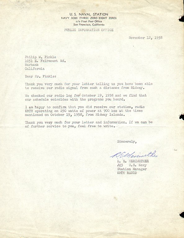 MIDWAY ISLANDQSL from KMTH on 19 October 1958 on 990 KHz. Power was 250 watts.This QSL letter was from radio station KMTH (MIDWAY-TERRITORY HAWAII) that operated for the Naval personnel stationed on the island. As I recall, we were about 500 miles east of Hawaii when I picked up KMTH. I was serving on a USN Destroyer and the skipper was nice enough to let me carry my old Hallicrafters SX-71 receiver aboard and I had a long wire strung between her two stacks. |
