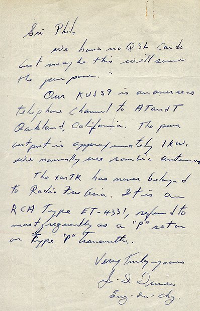 GUAM (MARIANA ISLANDS)QSL from KUJ39 on 27 December 1954 on 9.490 MHz. Power was 1000 watts.This QSL letter was from KUJ39 an overseas telephone channel of AT&T at Agana. The station was heard with a looped tape announcement: "This is a test transmission for circuit adjustment purposes from a station of the Radio Corporation of America. This station is located in Agana, Guam." This was a typical type of announcement for these stations. I observed in my report that WRTH said that Radio Free Asia used to be transmitted from Agana on 9.490 MHz on KUJ39 but the engineer disagreed with that. |