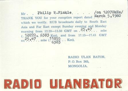 QSL card from Radio Ulan Bator on 5 March 1980 on 12.070 MHz.