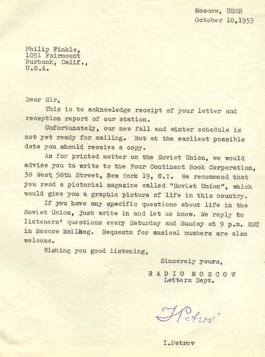 USSR"QSL" letter from Radio Moscow.This absolutely no data QSL letter was from Radio Moscow for a report in mid 1953. This letter had a stamped signature of I. Petrov who signed Radio Moscow letters back into the 1930s. Radio Moscow used to transmit on very many frequencies to North America, Many of the west coast receptions were from Siberian outlets. Here's an example of their Winter 1960 schedule (this one for the UK):