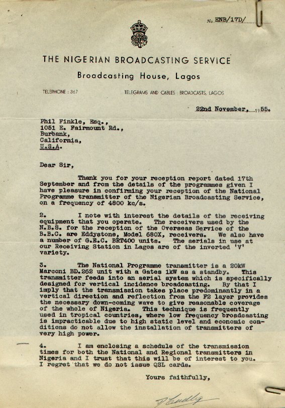 NIGERIAQSL letter from the Nigerian Broadcasting Service in Lagos on 16 September 1955 on 4.800 MHz. Power was 20 kw.This very informative verification letter is from the Nigerian Broadcasting Service in Lagos whilst Nigeria was still a British colony.. This station was well received on the West Coast in the early and late evening hours. |