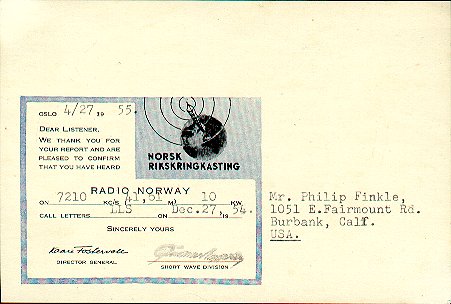 NORWAYQSL cards from Radio Norway station LLS on 27 December 1954 on 7.210 MHz (power was 10 kw.) and LLG on 27 December 1954 on 9.610 MHz (100 kw.)