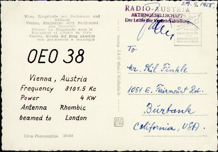 QSL from Radio Austria station OEO38 on 29 September 1955 on 8.1015 MHz. Power was 4000 watts.