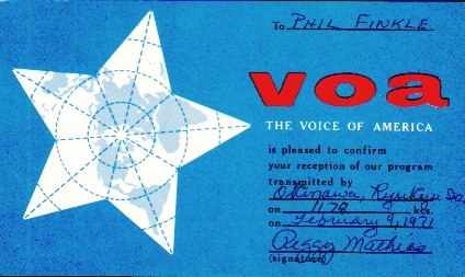 RYUKYU ISLANDSQSL from the Voice of America on 9 February 1971 on 1178 KHz.This QSL card was from VOA relay station in Okinawa. I will never forget this logging. I was listening to it and logging it until 0559 local time when the Sylmar earthquake hit (I think it was a 6.8). The house rolled back and forth like a small ship in a severe storm as we were only about 5 miles from the epicenter! |