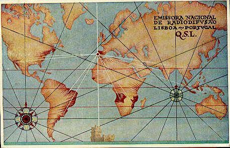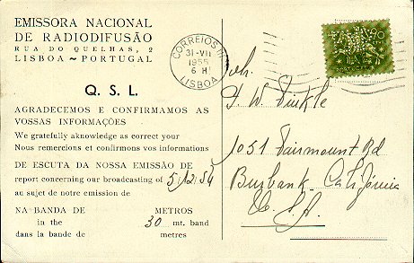 PORTUGALQSL card from Emissora Nacional in Lisboa on 9.747 MHz.This QSL was from Emissora Nacional in Lisbon from mid-1955. This station transmitted only in Portuguese. It was well received on the West Coast. It had great musical programs! In later years, it instituted an English Service with this announcement "This is the Voice of the West. The West Can and Will Win!" |