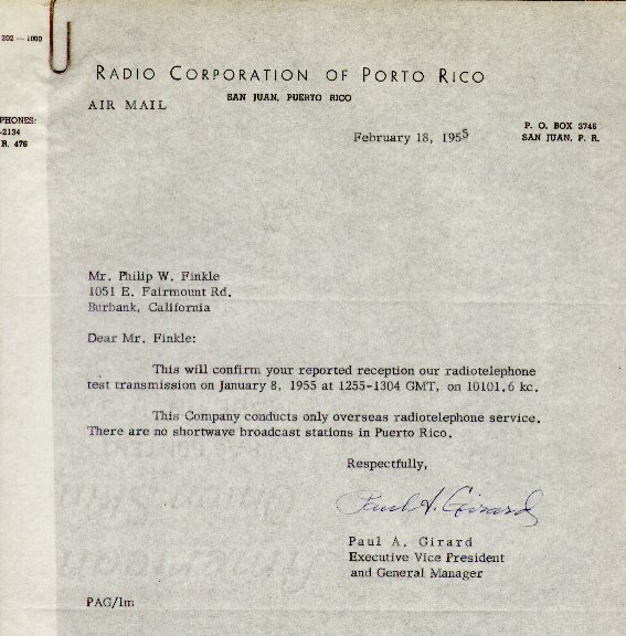 This QSL letter was from the Radio Corporation of Porto Rico, San Juan.