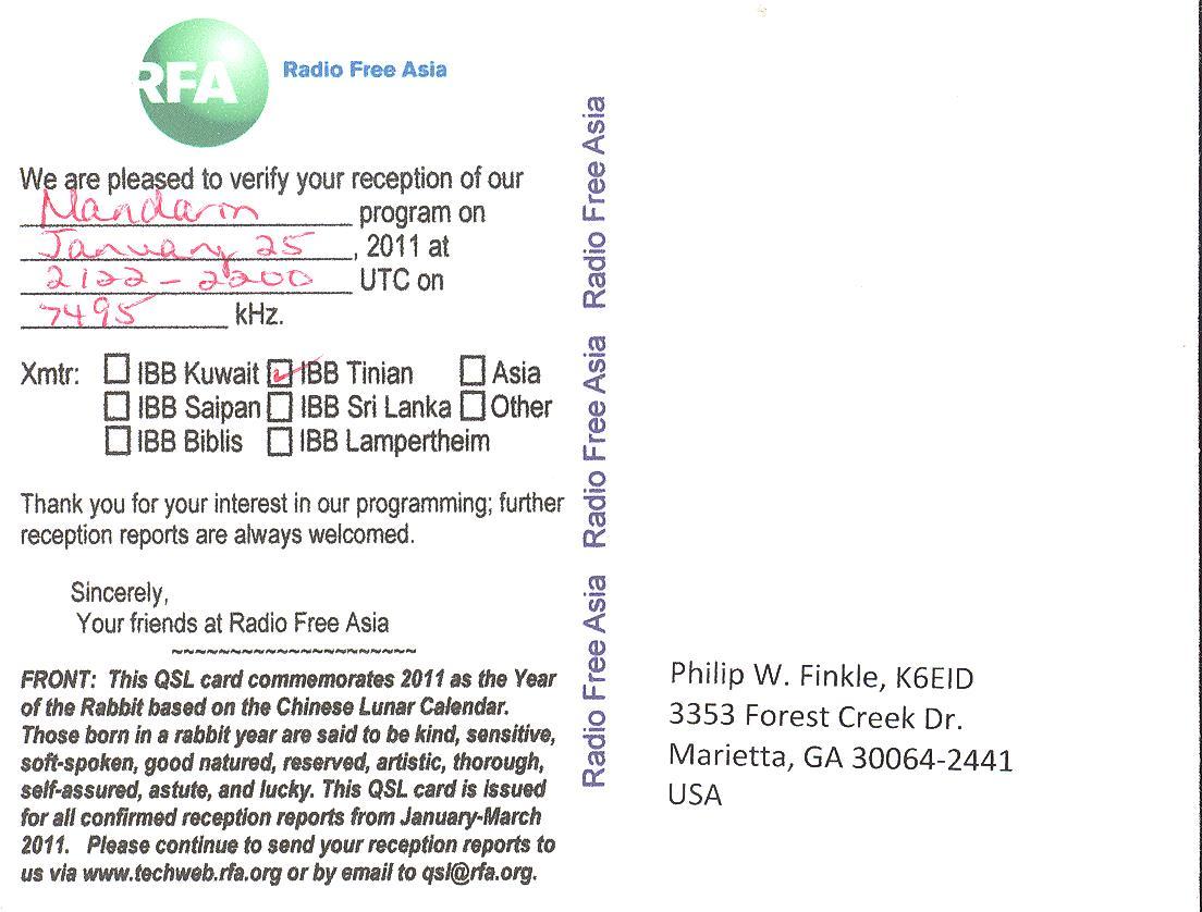QSL card from Radio Free Asia on 7.495 mHz on 25 Jan. 2011