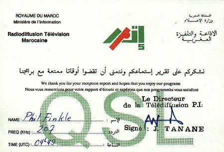 This QSL card was from Radiodiffusion Télévision Marocaine in Rabat.