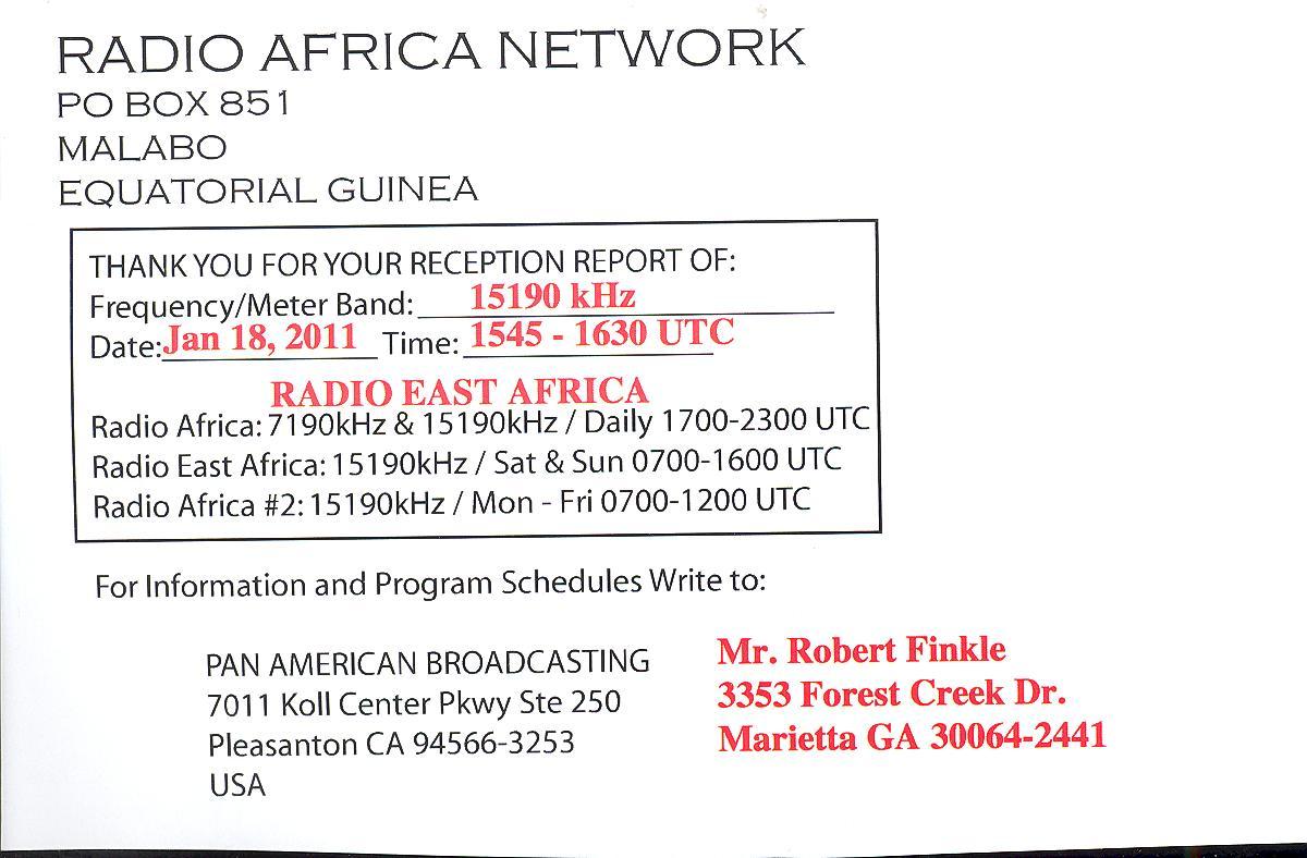 QSL card from Radio East Africa on 15.190 mHz on 18 Jan. 2011