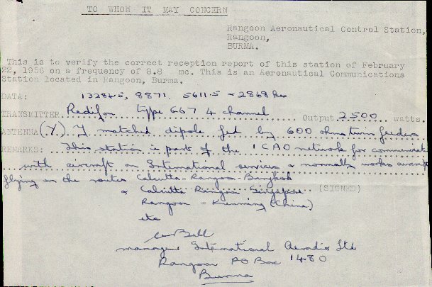 This QSL form was from Rangoon Burma Aeradio. Another interesting bit on information from the verification signer.