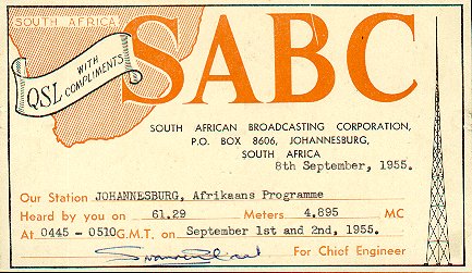 UNION OF SOUTH AFRICAQSL cards from the South African Broadcasting Corp., Johannesburg, on 1 September 1955 on 4.895 mHz and for Springbok Radio on 2 September 1955 on 7.295 MHz..