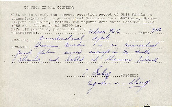 QSL from Shannon Aeradio on 11 December 1955 on 5.6265 MHz. Power was 3000 watts.