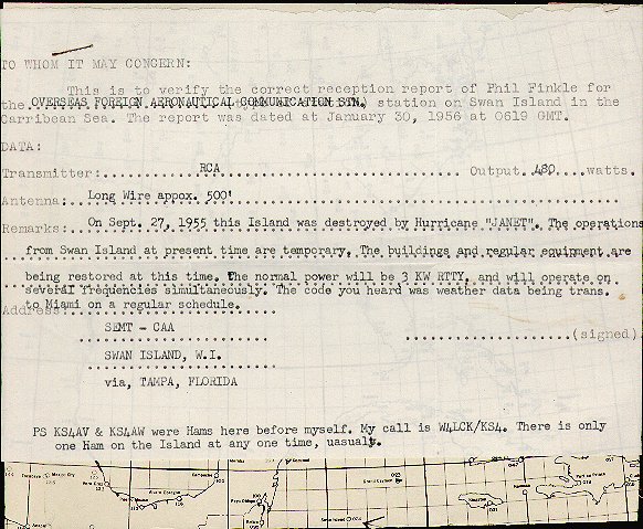 SWAN ISLANDQSL from Swan Island OFACS on 30 January 1956 on 5.945 MHz. Power was 480 watts.This QSL form was from the Swan Island Overseas/Foreign Aeronautical Communications Station. At this time Swan Island was under U.S. Administration, today it is part of Honduras. Another interesting bit on information from the verification signer. |
