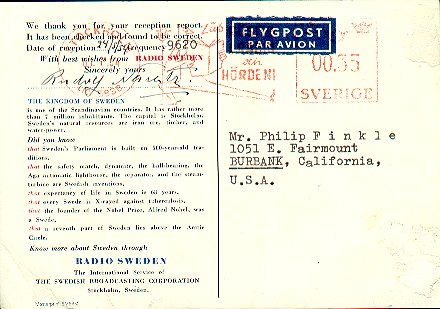 This QSL was from Radio Sweden. Arne Skoog, now deceased, had a great program called "Sweden Calling DXers." This station was well received on the West Coast.