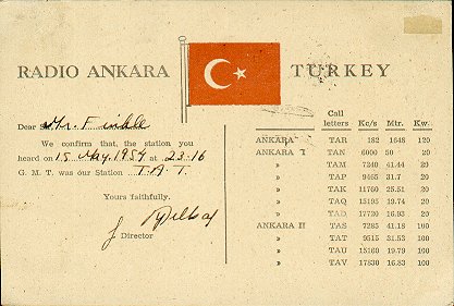 TURKEYQSL card from TAT, Radio Ankara, 15 May 1954 on 9.515 MHz.This QSL was from Radio Ankara for a report of their North American Service. Reception was somewhat marginal on the West Coast, except, interestingly enough, on rainy afternoons (the weather seemed to enhance the propagation!) |