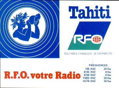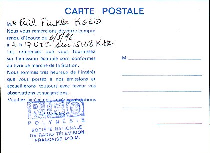 FRENCH POLYNESIAQSL card from Radio Tahiti on 6 May 1996 on 15.168 MHz.This QSL was from Radio Tahiti in Papeete. This station has been on the air for many years and has provided many hours of Polynesian music. Years ago they used to have a 5 minute English newscast by a man who I swear could not speak a word of English! |