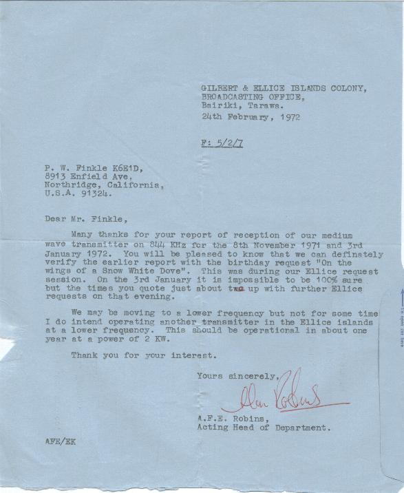 This QSL letter was from the Gilbert & Ellice Islands Broadcasting Office in Bairiki.