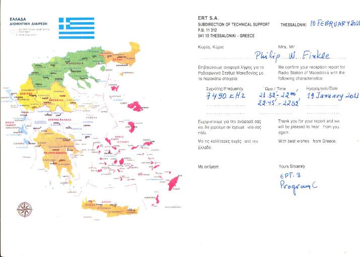 QSL card from Hellenic Radio Television on 7.450 mHz on 19 Jan. 2011