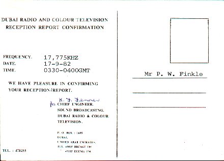 QSL card from RCTV Dubai on 17 September 1982 on 17.775 MHz.