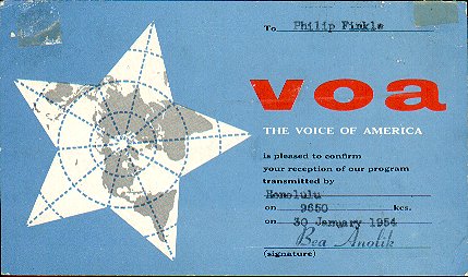 This QSL was from Voice of America relay station located near Honolulu, Hawaii.