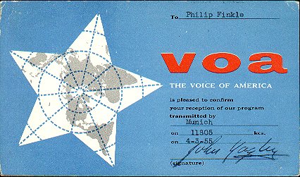 QSL card from VOA in Munich on 3 April 1955 on 11.805 MHz.