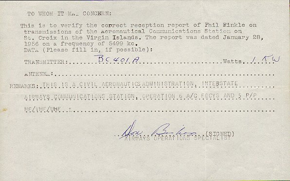 QSL from St. Croix Aeradio on 28 January 1956 on 5.499 MHz. Power was 1000 watts.