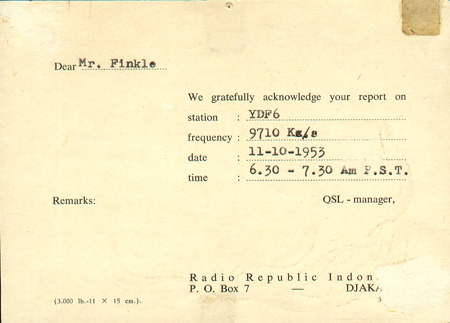 This QSL was from the Voice of Indonesia. This was a very popular station that was well heard on the west coast with its morning English broadcast.