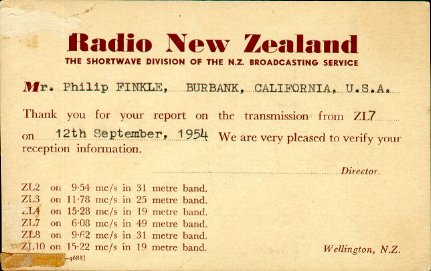 NEW ZEALANDQSL card from the New Zealand Broadcasting Service Stations in Wellington:ZL3 on 20 October 1954 on 11.780 MHz. Power was 7500 wattsZL7 on 12 September 1954 on 6.080 MHz. Power was 7500 wattsZL19 on 22 October 1954 on ???? MHz. Power was 7500 watts
