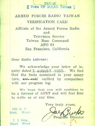 REPUBLIC OF CHINA (TAIWAN) QSL card from Armed Forces Radio Taiwan for report of 3 August 1955 on 7.205 mHz. Power was 100 watts.